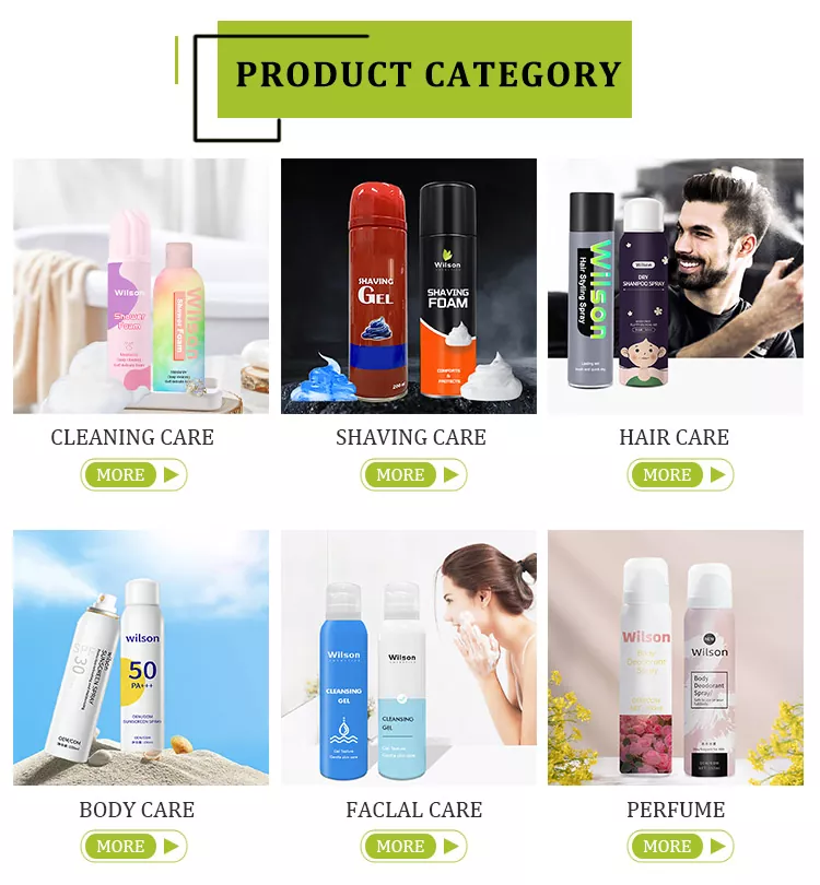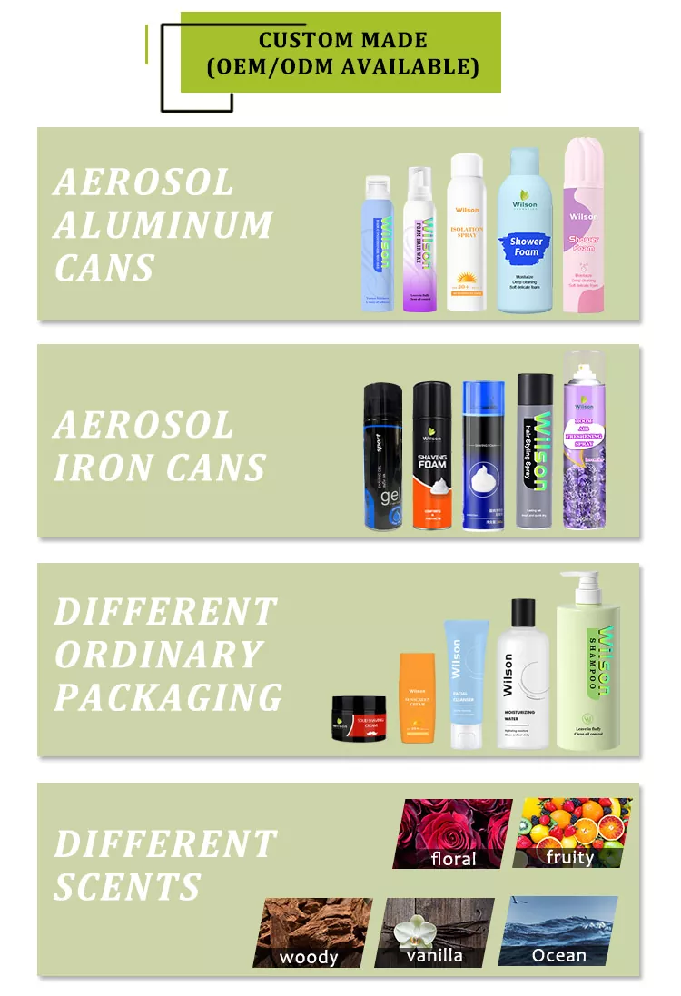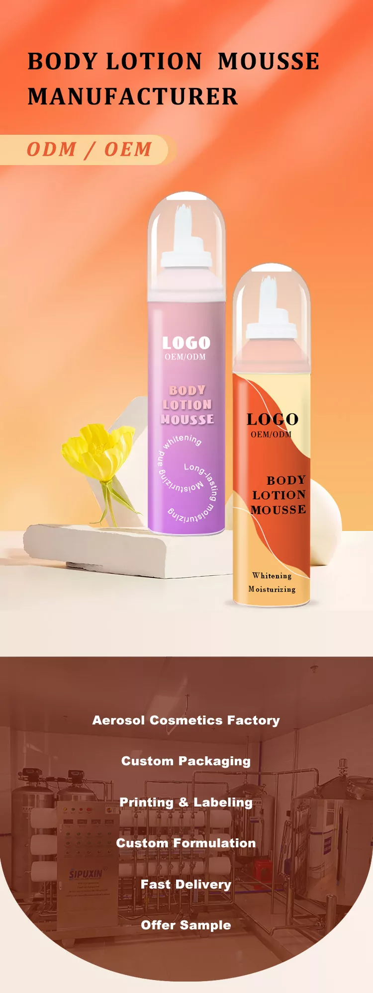 Wilson Quick Absorption Lightweight Texture Body Lotion Mousse je dlhotrvajúci hydratačný krém, ktorý sa dokáže absorbovať do tela. Naša pena sa dodáva vo forme aerosólu v hliníkovej plechovke, ktorá po stlačení vytvára bohatú penu. V porovnaní s ťažkým a lepkavým pocitom tradičných pleťových vôd, naša telová pena prináša ľahký dotyk, ako oblak mäkkého a hustého. Okrem toho máme na výber rôzne formulácie, napríklad môžete pridať do receptúry obsahuje vysoko účinné hydratačné extrakty, ako je viacnásobná kyselina hyalurónová, prírodné rastlinné extrakty a pod., vďaka čomu je mikroštruktúra peny priaznivejšia pre zloženie zložiek priamo pod kožou, aby mala intenzívnu hydratáciu a uzamykanie, dlhotrvajúci hydratačný účinok na pokožku. Pokožka je zvlhčená zvnútra von.
