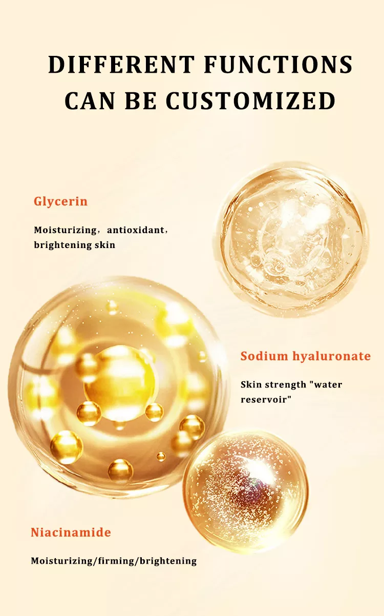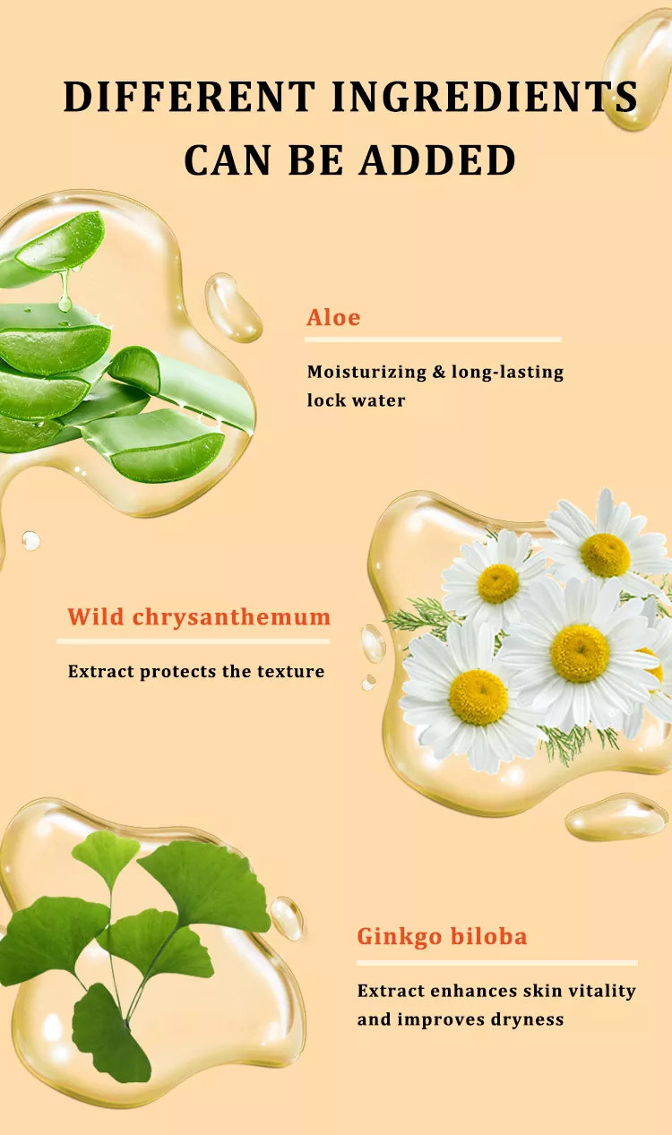 Môžeme tiež prispôsobiť požadované zloženie na základe špecifických zložiek produktu (napr. hlavná kyselina hyalurónová, niacínamid, vitamín E, špecifické rastlinné extrakty atď.), vône (napr. ruža, biely čaj, neparfumovaný atď.) a či má špeciálne účinky (napr. silná oprava, bielenie, spevnenie atď.).